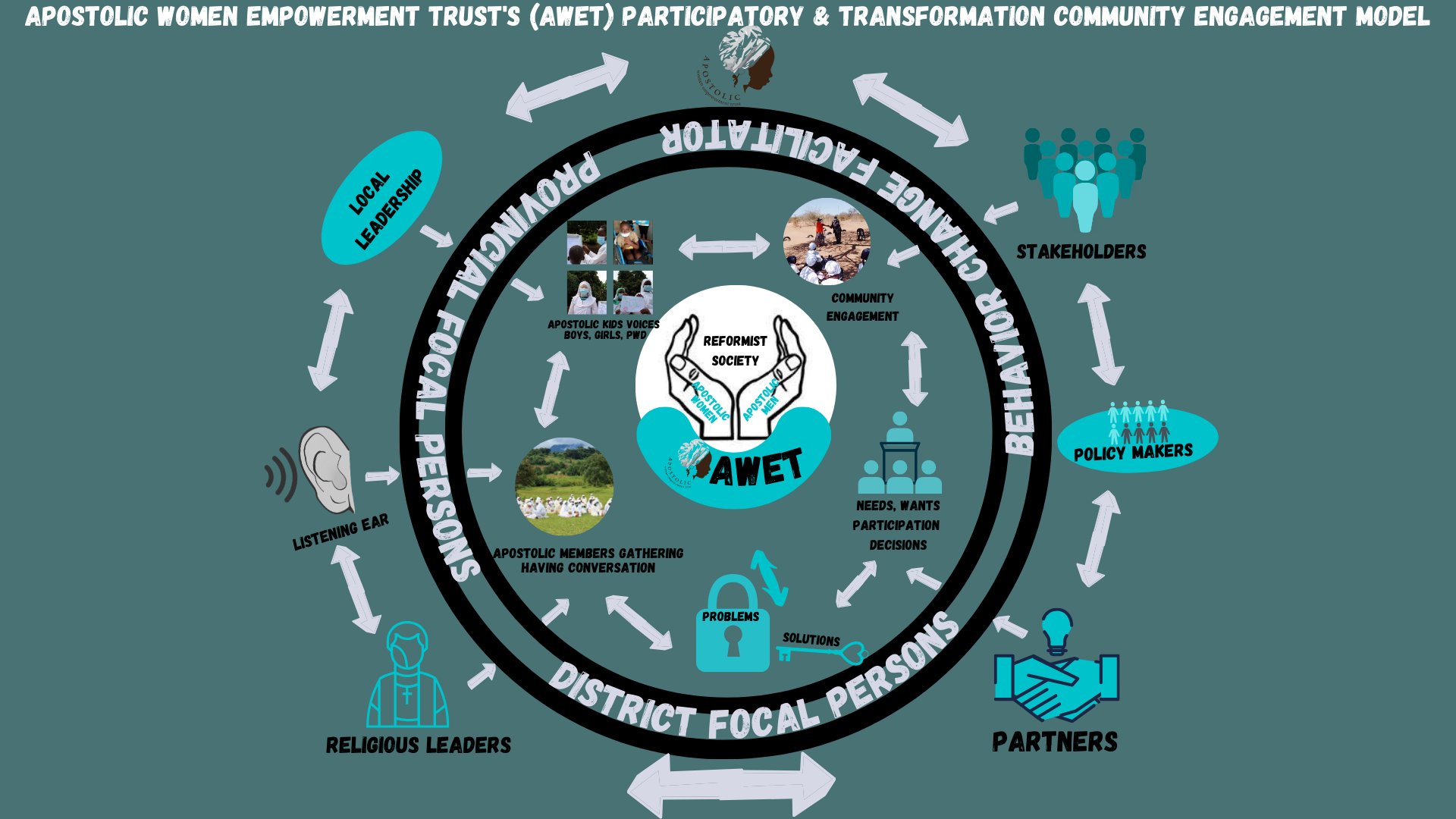 The Apostolic Women Empowerment Team (AWET) aims to empower Apostolic women and adolescent girls to exercise their rights and self-efficacy despite strict religious doctrine and modern health services. AWET uses a holistic approach to address socio-cultural and religious drivers of objection to modern health services, addressing key doctrines, beliefs, attitudes, and social norms. The team uses a communication for development strategy to facilitate behavioral and social changes among Apostolic communities.